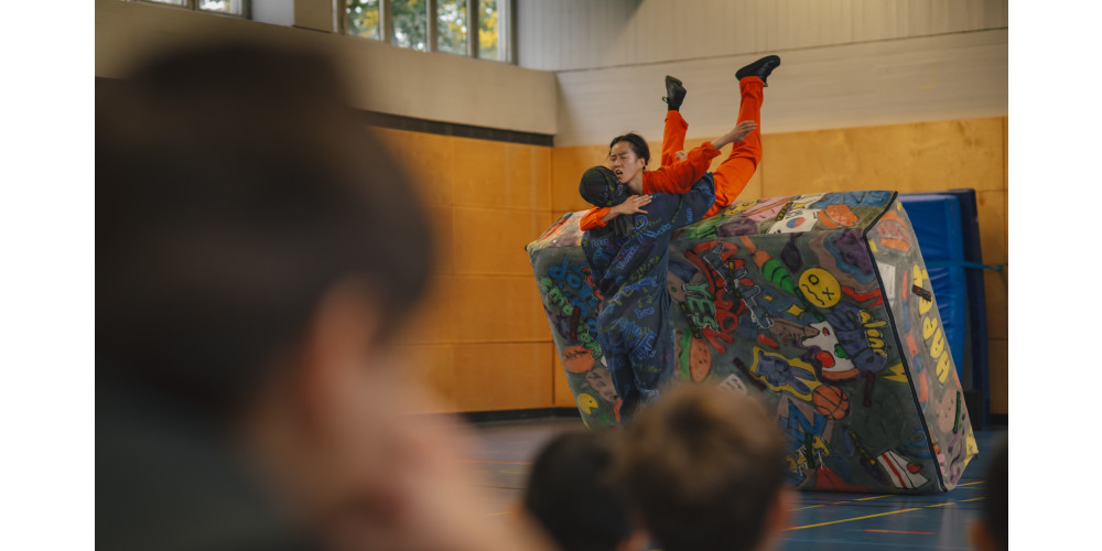 Onstage, a self-made wall becomes an installation. The mattress‘ exterior and the male dancer’s clothing feature street-graffiti style painting. Jin wears orange, Jihun wears deep blue with a black hood covering his head. Through chase sequences and physical confrontation, the choreography presents inner tension. At the work's conclusion, both dancers face away from the audience, collectively pushing down the wall. „Wind“ is never physically present but suggested as an invisible energy storm through dancers' movements. In the post-performance workshop, children are excited to share what they saw and explore their emotional vocabulary through group movements.