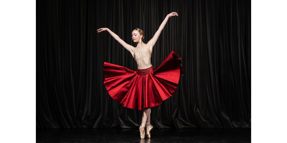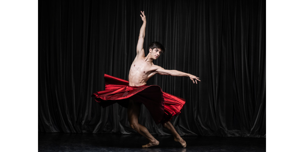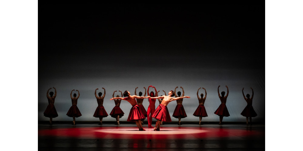 Mit Rose vor dem Mund eröffnet Shani Obadia in „Requiem for a Rose“ von Anabelle López Ochoa den zweiten Teil des Abends. Kein strahlendes Lächeln ins Publikum, kein Pariser épaulement. Mit zielgerichtetem Blick streckt sie sich elegant nach oben und krümmt sich, so dass ihre langen Haare ihr Gesicht und die leuchtende Rose verschwinden lassen. Sie ist der Herzschlag des Stückes. Begleitet wird ihr Puls von 12 Rosen, getanzt von 12 Tänzer*innen in schimmernden dunkelroten Röcken (Kostüme: Tatyana van Walsum).