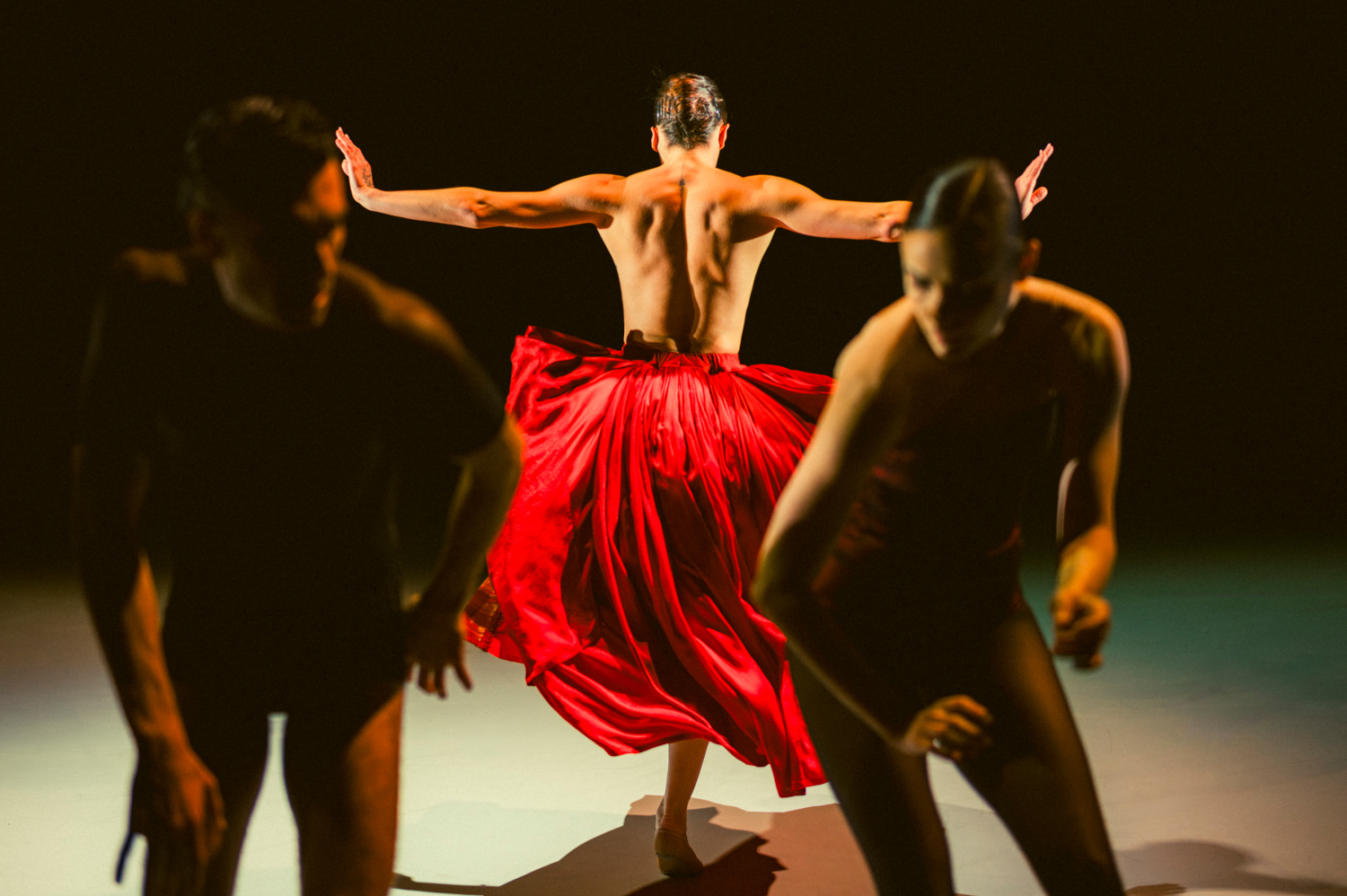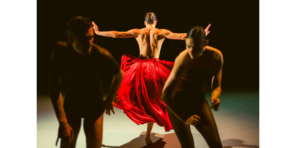 Die Reihenfolge im Titel entspricht dem Alter der Choreografen, nicht aber dem Ablauf des Abends. Der beginnt mit „Bella Figura“ von Jiří Kylián von 1995. Nach einem Warm-up der Tänzer*innen auf der Bühne entwickeln sich aus Solos Duos und Trios. Elegische Bewegungen unterstreichen die zum Teil chorale Musik. Es ist ein bewegungsreiches Stück, das neben dynamischen Momenten auch Platz für Ruhe hat. Mit den für Kylián typischen weitgreifenden Bewegungen und einer großen Bandbreite von Varietäten reihen sich die Tänze wie Perlen aneinander.