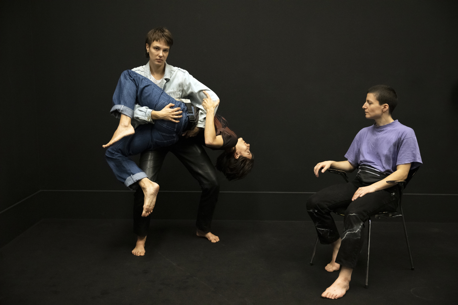 Auch inhaltlich war diese Tanzplattform auf den ersten Blick erstaunlich unpolitisch. Jessica Nupen verhandelte in „Reparation Nation“ immerhin das Thema von post-kolonialer Restitution, doch ansonsten war da weitgehend Schweigen im Walde. Die Kriege auf dieser Welt, soziale Ungerechtigkeit, Klimawandel – war das was? Selbst sich als queer-feministisch verstehende Akteur*innen wie Katharina Senzenberger und Team feiern mit „Lovedance“ in großen kitschgefährlichen Bildern nur das romantische Loblied auf die monogame Liebe – traditioneller wird’s nimmer, auch wenn da kein heteronormatives Paar miteinander in den Flugseilen turtelt. Und wenn Stefan Kaegis „Spiegelneuronen“ nicht einmal in einer Fußnote zu den autoritär-totalitären Verführungspotentialen des Settings kommt, dann weiß man gar nicht mehr, wo überhaupt noch kritische Geister zu erwarten sind. Ausnahme von der Regel ist hier „Langes Wochenende“ von Elsa Artmann und Sanfte Arbeit, die immerhin die eigenen Arbeitsbedingungen sehr klug aufspießen und sezieren. Die lächelnde Repectfulness wird zur betonierten Fratze der kalkulierten Selbstausbeutung, das Projekt zum Fetisch, die Arbeitsbeziehungen der emotionalen Ausbeutungsproblematik durchaus anverwandelt. Das Poetische und Politische – hier geht es wunderbar zusammen und ist vielleicht sogar als vorauseilende Kritik der arg harmoniebewussten Tanzplattform zu lesen.