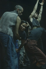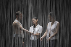 Three dancers together elongate the word „again“. The sound is stretching, deforming, almost losing semantics. In a scenario of a system off, yet I remain in the audience seat, trying to understand, analyze, assign meaning.