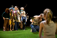 In „The Land“ zeigt die Bühne des Münchner Cuvilliestheaters grüne Wiesen und Wälder mit Bauernhöfen zwischen sanften Hügeln, auf einem eine Kirche. Doch schon bald dröhnt über der voralpenländischen Natur drohend Helikopterlärm.