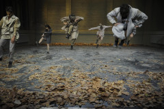 Toula Limnaios' Stück „clair obscur“ in der Halle Tanzbühne Berlin: Die Zuschauer*innen sitzen verteilt auf den Schmalseiten des Raums. Die Bühne ist in vier schmale, von Stoffgazen getrennten Gassen gegliedert. Acht Tänzer*innen teilen sich in den unterschiedlichsten Konstellationen diese schmalen Gassen.