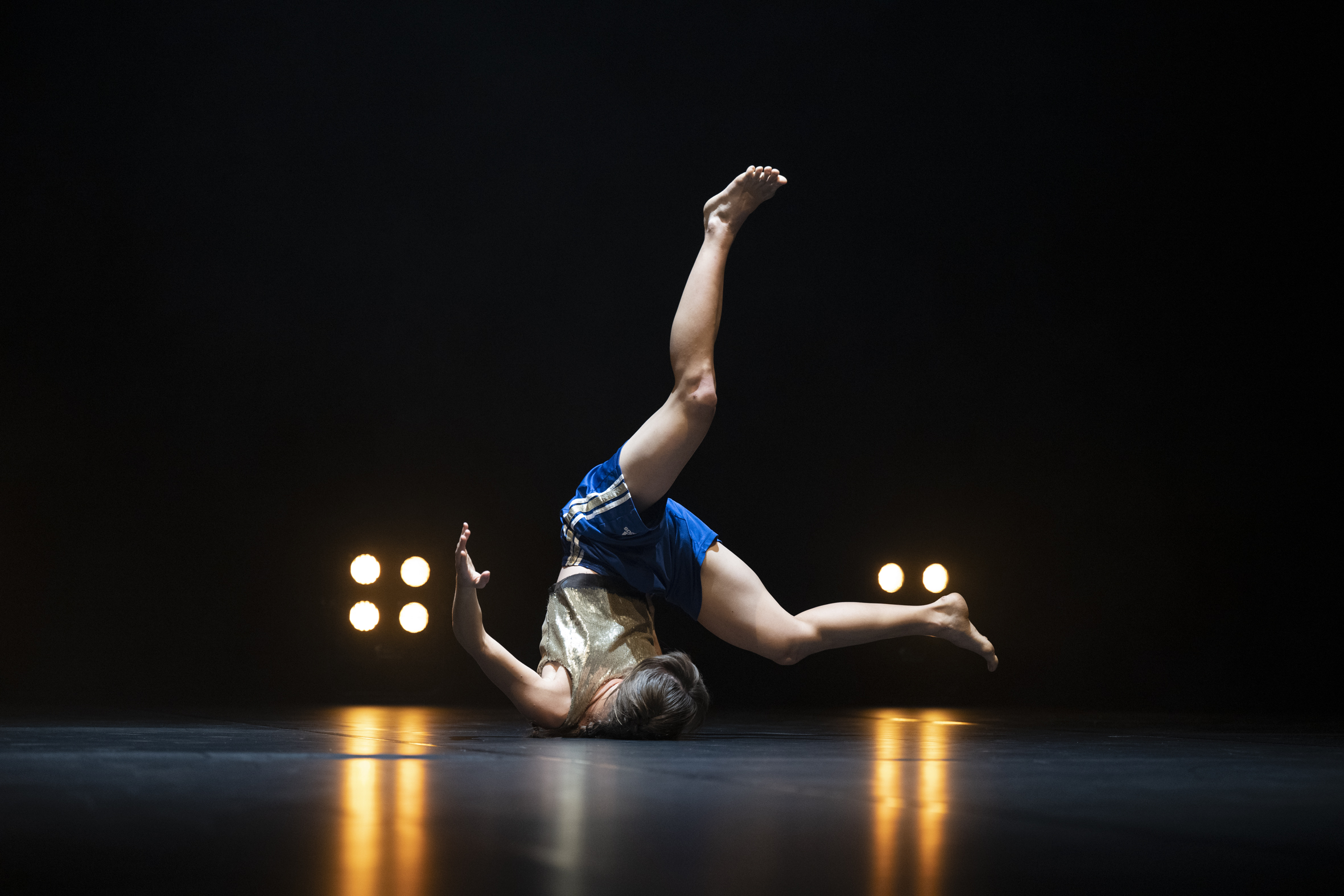 Und ein anderer grauer Nebel zieht auf, der immer dichter wird und bald seinen Schleier über den ganzen düsteren Saal des Toihaus Theaters ausbreitet. Mitten in diesem Nichts, mit dem „Echoes of Resistance“ von Rosana Ribeiro beginnt, zeichnet sich die dunkle Silhouette einer Tänzerin ab. Langsam taucht sie aus diesem Nebel auf, vom goldenen Licht der Scheinwerfer umspielt, während bedrohlich wirkende Musik den Raum erfüllt. Die Spannung knistert – bis sie bricht. Ein plötzliches Fallen. Nur in allerletzter Sekunde kann sich Jin Lee abfangen, als würde sie gerade so ihren Kopf über Wasser halten. Mit Beinen, Rumpf und Armen in die Luft gestreckt, scheint sie am Boden zu schweben. Das Bild erinnert etwas an einen Käfer, der gefallen ist und versucht, sich aufzurappeln, um wieder fliegen zu können. Mit viel Ausdauer und Kraft kommt sie schließlich wieder auf die Beine.